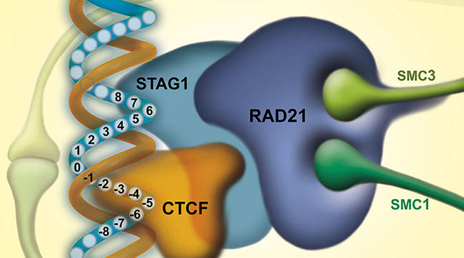 A CTCF és a cohesin fehérjék elhelyezkedése a DNS-en a CTCF kötőhelyhez viszonyítva